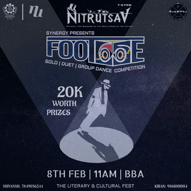 Footloose – Dance Your Heart Out! Step into the spotlight at Footloose, Nitrutsav's electrifying dance competition! Show off your talent in solos, duos, or crews and battle for ultimate glory. With mesmerizing moves and high-energy performances, this is your chance to shine and leave the crowd in awe. Let your rhythm speak louder than words—join us and own the stage!